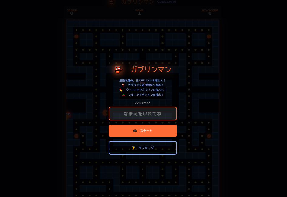 インストール不要・登録不要で今すぐ遊べる「ガブリンマン」は、名作パックマン風のブラウザ迷路ゲームです。ドットをつまみ食いしながらゴーストを避ける懐かしのアクションが、スマホ・PCで完全再現。ちょっとした暇つぶしからハイスコア挑戦まで楽しめます!