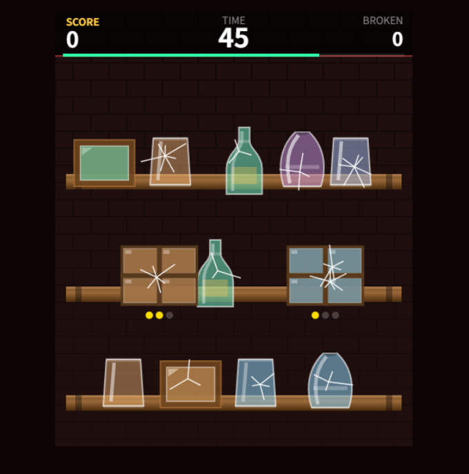 「ガラスクラッシュ!」は、棚に次々と現れるガラス製品を制限時間内にどれだけ壊せるかを競うスコアアタック型のアクションゲームです。