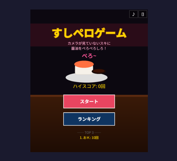 すしペロゲームは、和室の天井に設置された監視カメラの隙を突き、目の前にあるお寿司の醤油をこっそり舐めるという、スリルと背徳感が入り混じったユニークなアクションゲームです。プレイヤーはカメラがこちらを向いていない一瞬の隙を狙って操作を行い、制限時間内にどれだけ多くの回数を稼げるかに挑戦します。緊迫感のあるBGMと、バレた瞬間のドラマチックな演出が、単純なルールの中に深い没頭感を生み出しています。